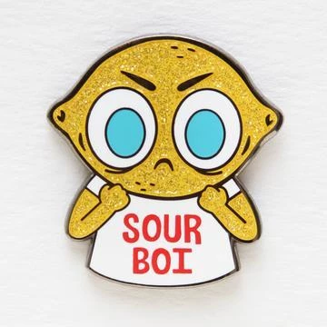 “Sour Boi” is a hard enamel pin with black nickel plating, measuring 1.5 inches tall. Featuring glitter accents, silkscreening, double rubber clutch back, and the Jellykoe logo and date backstamp. Comes on a protective card.